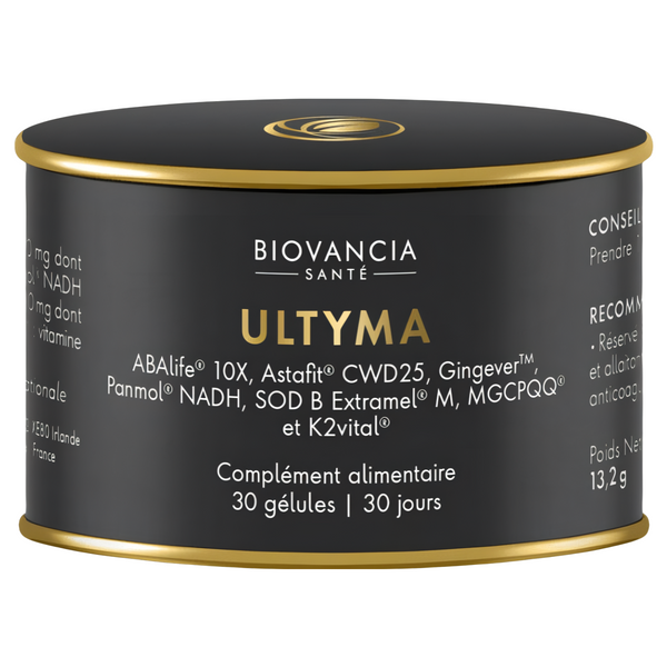 Ultyma est un complément alimentaire conçu pour favoriser la santé globale grâce à un mélange unique de sept ingrédients actifs. Cette combinaison soigneusement élaborée comprend ABAlife® 10X (extrait de figue), Astafit® CWD25 (astaxanthine), Gingever™ (extrait de gingembre), Panmol® (NADH), SOD B Extramel® M (concentré de melon), MGCPQQ® (quinone de pyrroloquinoline) et K2vital® (vitamine K2). Chaque composant est choisi pour ses propriétés spécifiques, contribuant ainsi à différents aspects du bien-être.